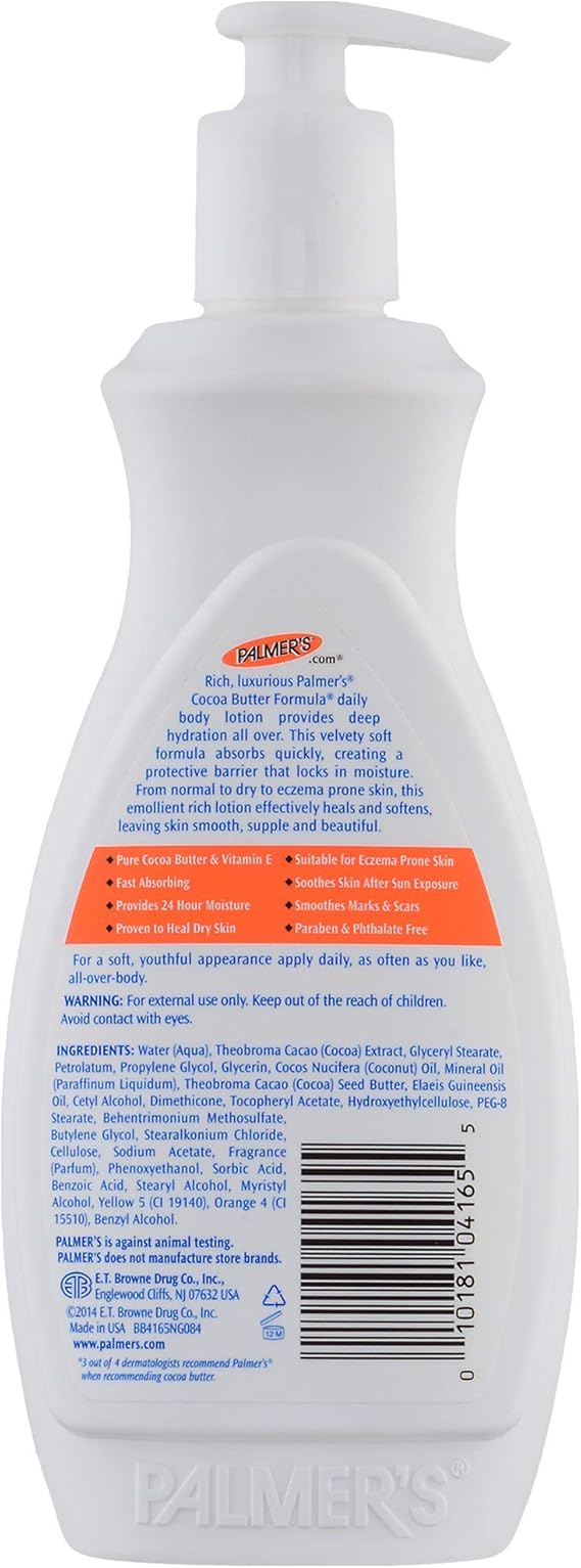 This velvety soft formula absorbs quickly, creating a protective barrier that locks in moisture. This classic product is an advanced moisturiser that softens, smoothes and relieves dry skin. Rich, luxurious palmer's cocoa butter formula daily skin therapy body lotion provides deep hydration all over. Our range of smooth, silky body butters & moisturizers leave your skin feeling healthier. Family owned and operated since 1840, palmer's is one of the longest standing skin and hair care brands made in the usa. This velvety soft formula absorbs quickly, creating a protective barrier that locks in moisture. This velvety soft formula absorbs quickly, creating a protective barrier that locks in moisture. Buy palmer's cocoa butter formula natural bronze gradual tanning moisturizer 250ml and other palmer's products at feelunique.com this creamy, moisturising lotion, with a special combination of pure cocoa butter and vitamin e, is the perfect way to keep your skin beautiful and soft with a natural looking glow. 4 out of 5 stars with 5217 ratings. Moisturize, soften and soothe baby's delicate skin with palmer's cocoa butter formula baby butter, a unique blend of pure cocoa butter, vitamin e and rich emollients. The fresh scent invigorates without overpowering. Rich, luxurious palmer's cocoa butter formula fragrance free daily body lotion provides deep hydration all over. Ships from and sold by amazon.ca.